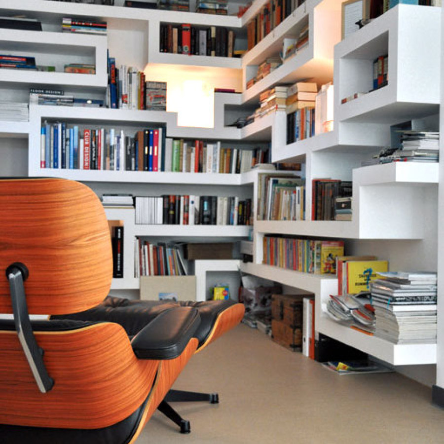 Ein Bücherregal, das in den Höhen verspringt, um auch jeder Buchgröße gerecht zu werden und übers Eck hinaus zieht um den Raum und den Leser zu erobern, why not?